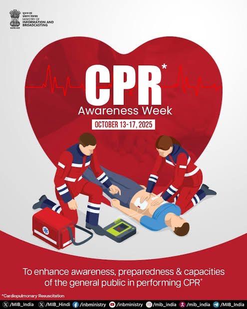 भोपाल : सोमवार, अक्टूबर 13, 2025/ 13 से 17 अक्टूबर 2025 तक पूरे मध्यप्रदेश में ‘कार्डियो-पल्मोनरी रिससिटेशन (CPR) जागरूकता सप्ताह’ का आयोजन किया जा रहा है। इस अभियान का उद्देश्य आम नागरिकों को CPR तकनीक के महत्व से अवगत कराना है जिससे वह आकस्मिक स्वास्थ्य आपात स्थितियों में जीवन रक्षक सहायता प्रदान कर सकें। CPR एक ऐसी तकनीक है जो आकस्मिक हृदयगति रुकने की स्थिति में व्यक्ति को पुनर्जीवित करने में सहायक होती है।