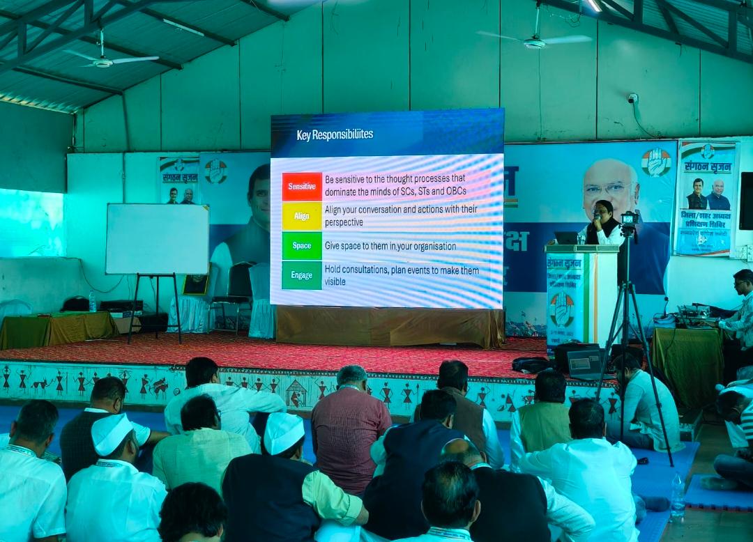 ल : गुरूवार, नवम्बर 6, 2025/ आज पचमढ़ी में आयोजित संगठन सृजन प्रशिक्षण शिविर के पाँचवें दिन सभी जिला कांग्रेस अध्यक्षों एवं विधायकों के लिए “जाति, संविधान और राजनीति” (Caste, Constitution and Politics) विषय पर एक महत्वपूर्ण सत्र आयोजित किया गया। इस सत्र का उद्देश्य भारतीय समाज और राजनीति में जाति की भूमिका, संविधान में उसके प्रावधानों तथा कांग्रेस के दृष्टिकोण की गहराई से समझ विकसित करना था।
