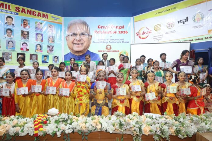 भोपाल : रविवार, जनवरी 18, 2026/ उलगत तमिल संगम, मदुरै तथा ऑर्गनाइजेशन ऑफ ऑल इंडिया तमिल संगम्स, चेन्नई से संबद्ध भोपाल तमिल संगम (बीटीएस) ने कैरियर कॉलेज ऑडिटोरियम, गोविंदपुरा, भेल, भोपाल में पोंगल 2026 के भव्य आयोजन का सफलतापूर्वक आयोजन किया। यह आयोजन मध्य प्रदेश की सांस्कृतिक इतिहास में एक महत्वपूर्ण उपलब्धि के रूप में स्थापित हुआ।