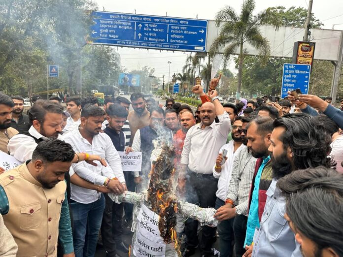 भोपाल : शुक्रवार, फरवरी 20, 2026/ भारतीय जनता पार्टी के भोपाल जिला अध्यक्ष रविन्द्र यति और युवा मोर्चा के जिला अध्यक्ष अजय पाटीदार के नेतृत्व में कार्यकर्ताओं ने दिल्ली में आयोजित एआई समिट के दौरान कांग्रेस कार्यकर्ताओं के अर्धनग्न प्रदर्शन पर शुक्रवार को कांग्रेस कार्यालय के सामने कांग्रेस और राहुल गांधी का पुतला जलाया। उन्होंने कहा कि कांग्रेस को इस अर्धनग्न प्रदर्शन और उसके पीछे की घृणित राजनीति के लिए देश की जनता से माफी मांगनी चाहिए।
