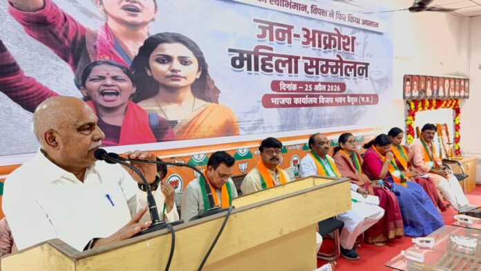 भोपाल : शनिवार, अप्रैल 25, 2026/ भारतीय जनता पार्टी के प्रदेश अध्यक्ष व विधायक हेमंत खण्डेलवाल ने शनिवार को बैतूल जिला कार्यालय में जन आक्रोश महिला सम्मेलन को संबोधित कर जन आक्रोश महिला पदयात्रा को हरी झंडी रवाना किया। भाजपा प्रदेश अध्यक्ष हेमंत खण्डेलवाल ने अपने संबोधन में कहा कि प्रधानमंत्री नरेन्द्र मोदी ने महिलाओं को अधिकार संपन्न बनाने और देश की संसद व राज्यों की विधानसभाओं में 33 प्रतिशत प्रतिनिधित्व देने के लिए नारी शक्ति वंदन कानून लेकर आए हैं। कांग्रेस पार्टी ने हमेशा से महिलाओं को मिलने वाले अधिकारों का विरोध किया है। जिस समाज व राष्ट्र ने महिलाओं को अधिकारों से वंचित किया वह समाप्त हो गए। कांग्रेस महिला विरोधी मानसिकता के चलते लोकसभा में ‘नारी शक्ति वंदन‘ अधिनियम का विरोध किया। कांग्रेस और अन्य विपक्षी दलों ने लोकसभा में सिर्फ एक अधिनियम का विरोध कर देश की आधी आबादी का अपमान किया है। मध्यप्रदेश और देश की नारी शक्ति कांग्रेस और विपक्षी दलों द्वारा किए गए अपमान का सबक जरूर सिखाएगी। सम्मेलन को केंद्रीय मंत्री दुर्गादास उइके, जिला अध्यक्ष सुधाकर पंवार, पूर्व सांसद ज्योति धुर्वे, विधायक गंगा उइके, महेन्द्र सिंह चौहान, पार्टी के प्रदेश प्रवक्ता व विधायक डॉ. योगेश पंडाग्रे ने भी संबोधित किया।