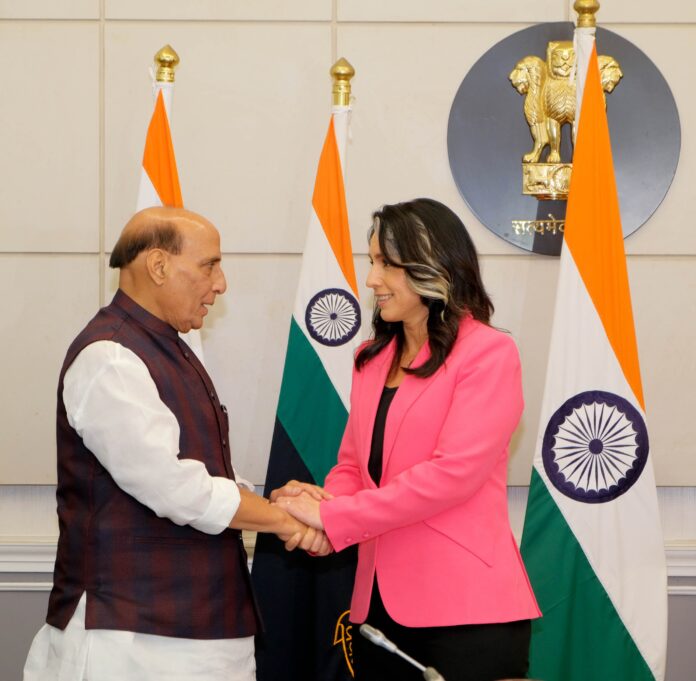 नई दिल्ली : मंगलवार, मार्च 18, 2025/ रक्षा मंत्री राजनाथ सिंह ने कल सोमवार को नई दिल्ली में अमरीका की राष्ट्रीय खुफिया निदेशक तुलसी गबार्ड के साथ एक महत्वपूर्ण बैठक की। प्रधानमंत्री नरेन्द्र मोदी और अमरीका के राष्ट्रपति डोनाल्ड ट्रम्प की हाल ही में हुई बैठक के बाद जारी संयुक्त वक्तव्य से यह बात सामने आई है कि चर्चाओं में भारत तथा अमरीका द्विपक्षीय रक्षा साझेदारी की बढ़ती ताकत की पुष्टि हो रही है।